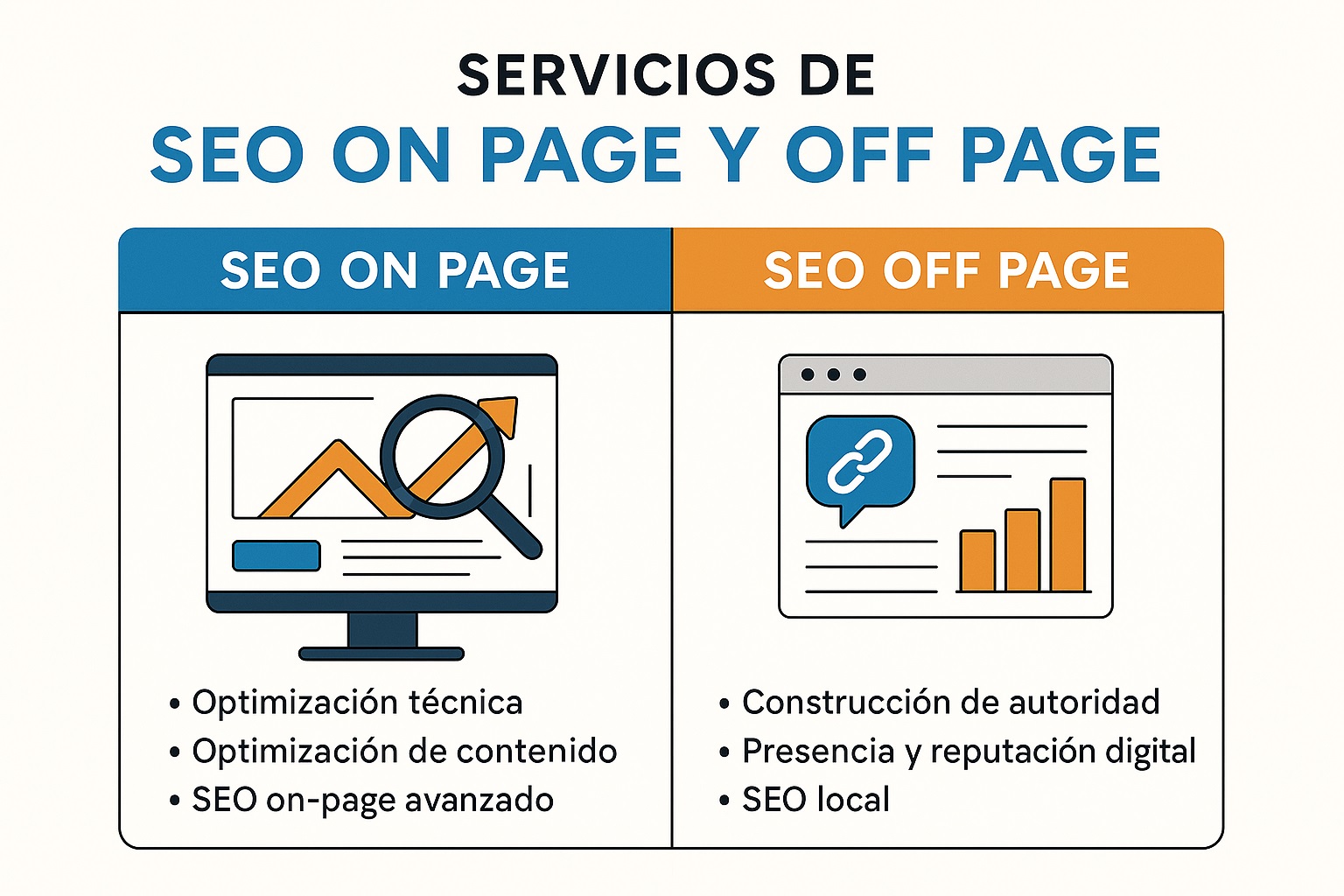 El On Page optimiza tu sitio internamente; el Off Page mejora su autoridad externa.